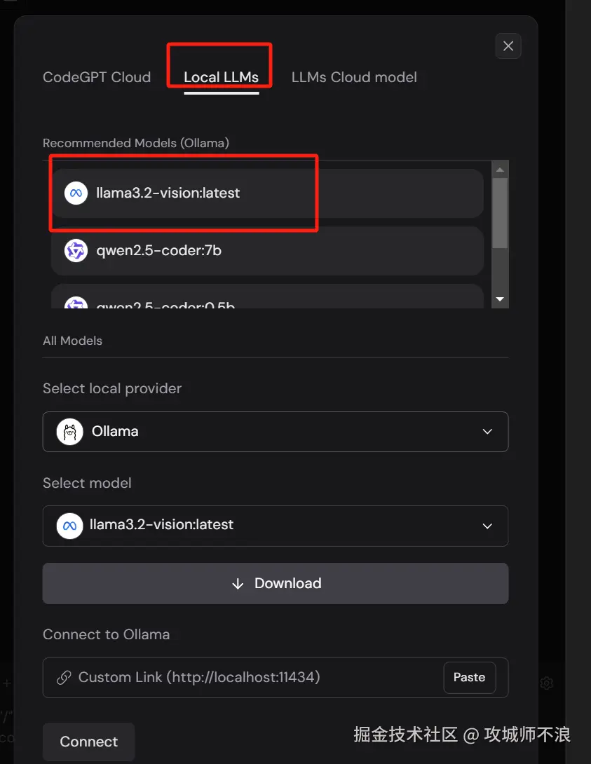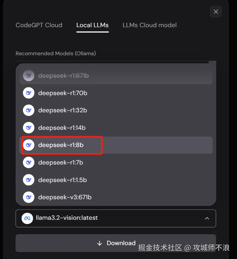 现在您已经成功安装了 Ollama 和 CodeGPT,接下来我们下载将在本地使用的DeepSeek大模型。