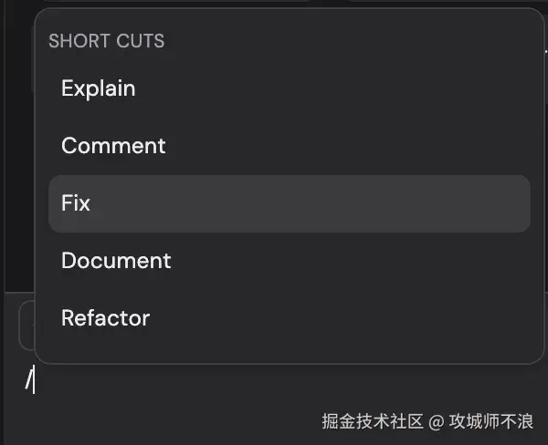 /fix— 用于修复错误或在代码中提出改进建议。/refactor— 用于清理和改进代码的结构。/Explain— 获取任何代码片段的详细解释。