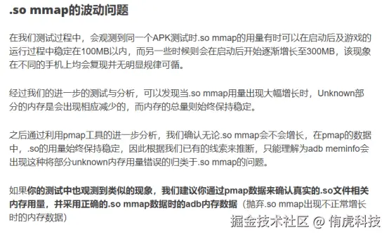 Q:我项目中.so mmap这一块占得特别高(就下图红框这块),最高甚至有400/500MB,用《Unity移动游戏性能优化全解析与小游戏转化的实战经验》这个链接里查出来的.so文件加起来远没有这么大。剩下的部分是什么导致的呢?接下来该怎么查呢?