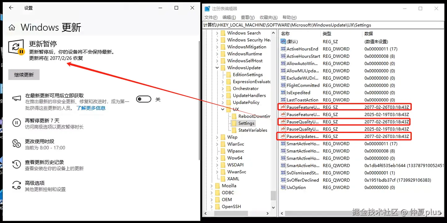 先在windows更新中,暂停更新7天,此时注册表项会增加几条关于时间的记录