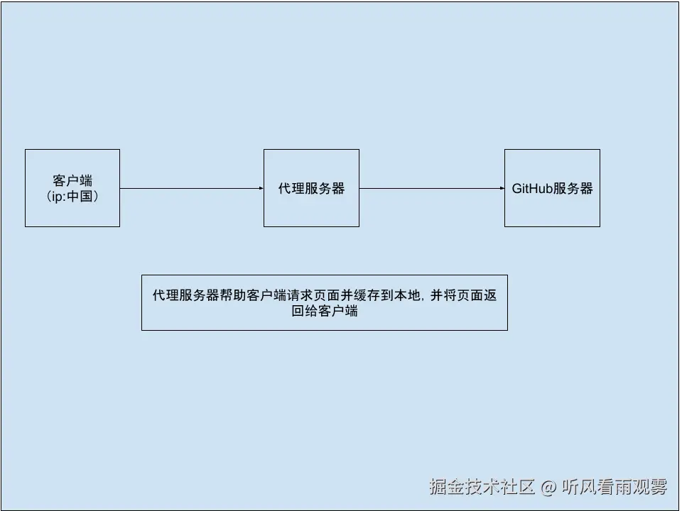 - 我们来举一个我们生活之中很常见的例子就可以知道了,我们有时候需要访问GitHub,但是由于自身IP访问限制,我们无法直接的去访问。这时候就需要一个代理服务器帮我们转发请求到目标的服务器,然后在将目标服务器的响应内容转发给我们客户端了。
