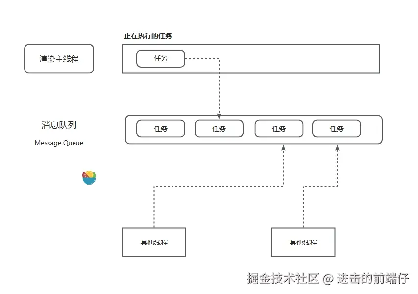 在Chrome的源码中,它开启一个不会结束的for循环,每次循环从消息队列中取出第一个任务执行,而其他线程只要在合适的时候将任务加入到队列末尾即可。