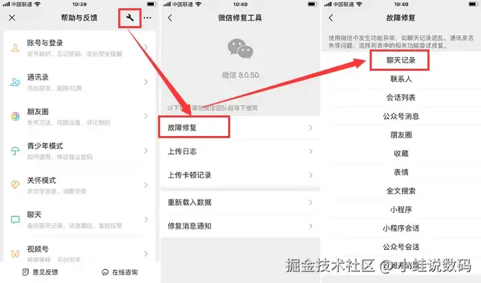 步骤2:进入微信修复工具页面,选择 【故障修复】 点击 【聊天记录】 ,按照提示完成修复过程,最后重启微信查看聊天记录是否复原。