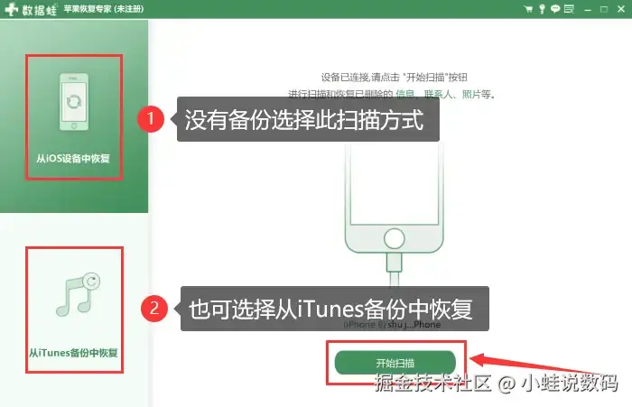 【数据蛙苹果恢复专家】就是一款十分专业的手机数据恢复软件,能快速扫描你手机可恢复的数据并高效恢复误删的内容。软件有免费的预览功能,您可以扫描后查看确保有你需要的内容再进行恢复。下面就是该软件的恢复过程: