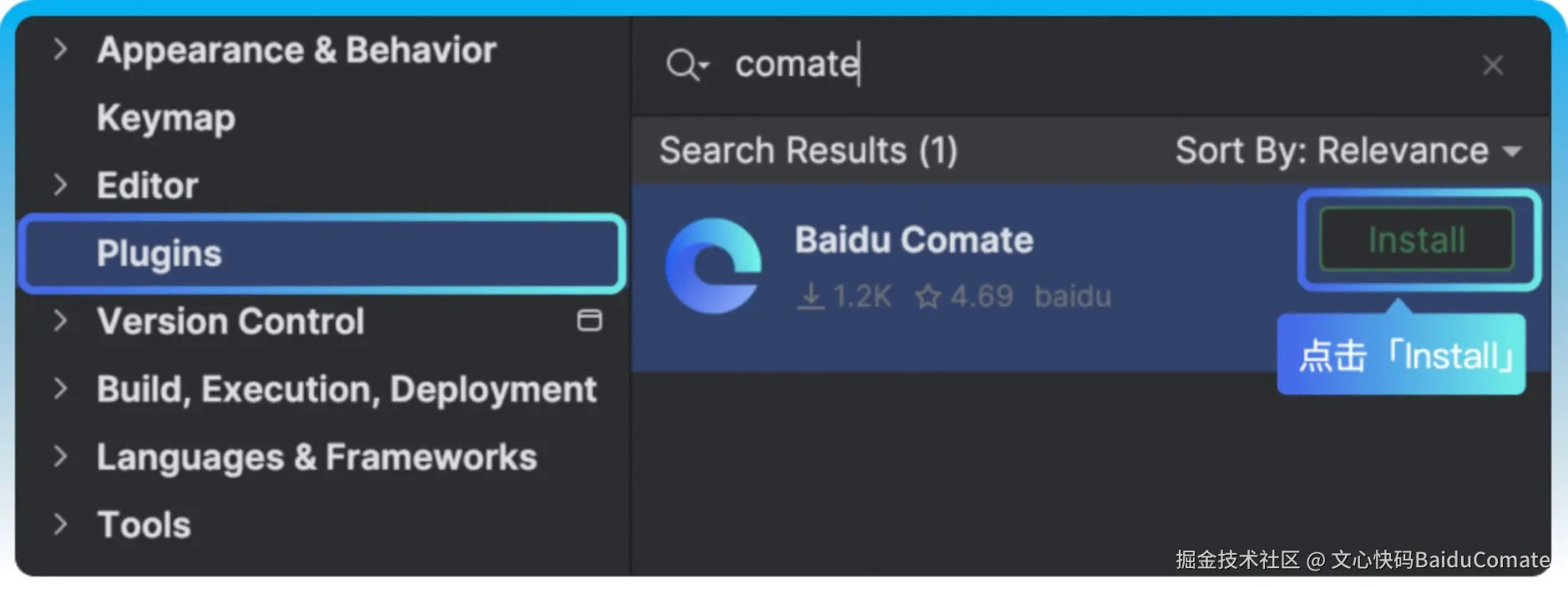 - 点击【Plugins】,进入 Marketplace 选项卡,搜索框输入【文心快码(Baidu Comate)】,找到 文心快码(Baidu Comate) 后点击安装。