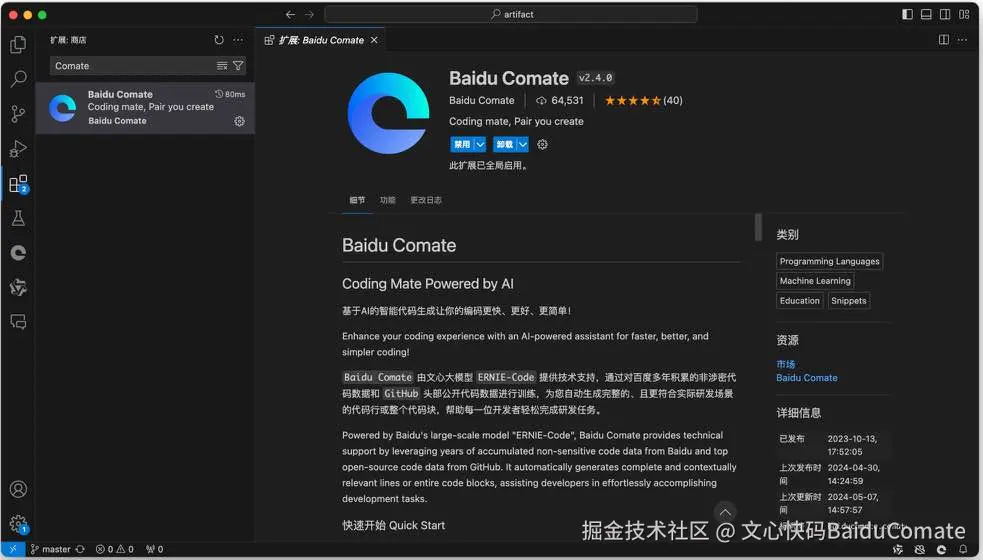 唤起 Visual Studio Code 插件市场直接安装 文心快码(Baidu Comate) 插件,安装后请重启 IDE,即可开启智能编码之旅。
