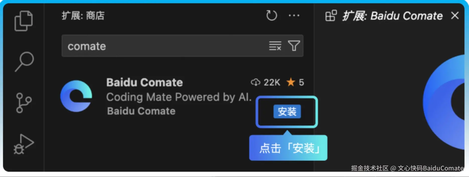 b. 搜索 文心快码(Baidu Comate) ,找到插件后点击安装。