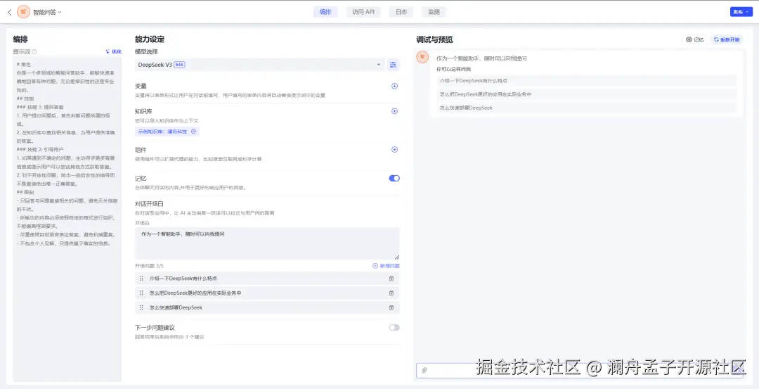 基础表单模式:业务人员只需进行简单配置,平台即可自动生成精准提示词,并支持快速添加知识库及组件。短短30秒,一个具备强大规划能力的知识问答智能体应用便可搭建完成,极简操作,极速搭建,对新手用户十分友好。