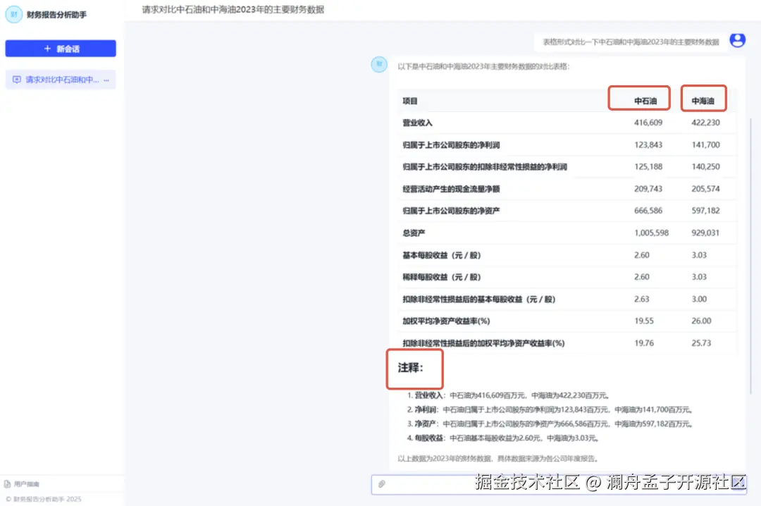 例如,向「财务报告分析助手」提出请求,要求“以表格形式对比中石油与中海油2023年的核心财务数据”。小助手迅速响应,提供了详尽的数据对比表格,并附加了贴心的注释说明,极大地方便了用户的分析与理解。