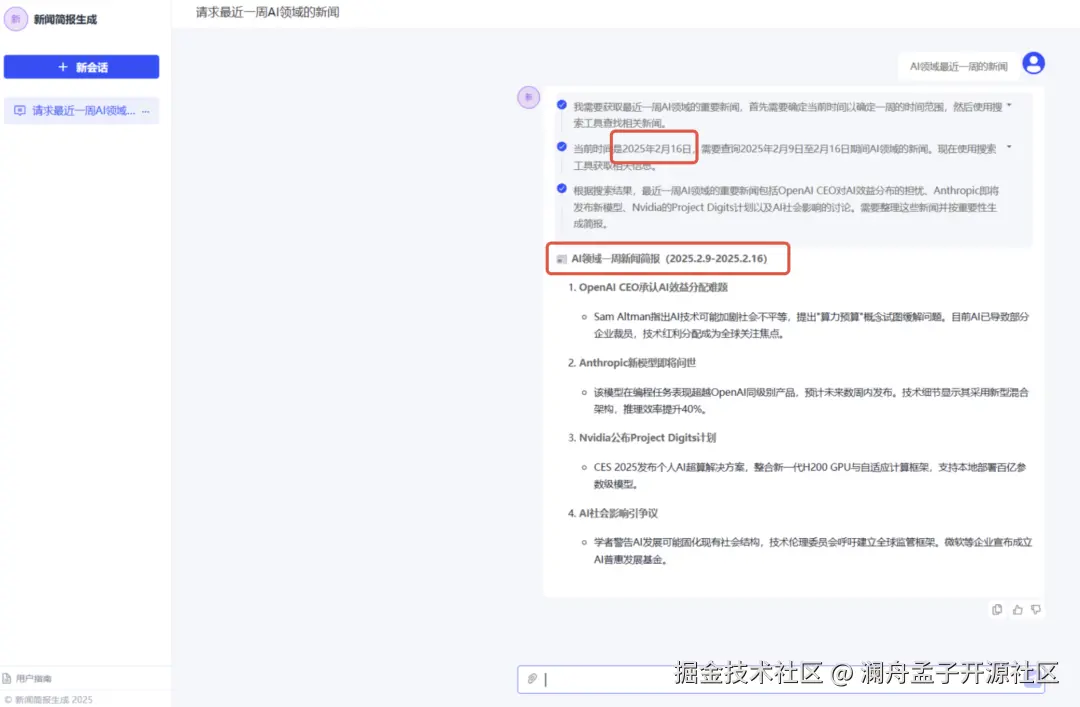 在热点新闻搜索写作方面,用户可以利用「新闻简报生成」小助手来整理“AI领域最近一周的新闻”,它能够快速响应指令,首先通过内置的“时间”组件获取当前时间,并推理得出最近一周的时间范围(2025.2.9—2025.2.16),随后,它调用“搜索”组件在互联网搜集该时间段内的AI新闻,最后,小助手会汇总这些信息,得出一份详尽的AI领域最近一周的新闻简报。