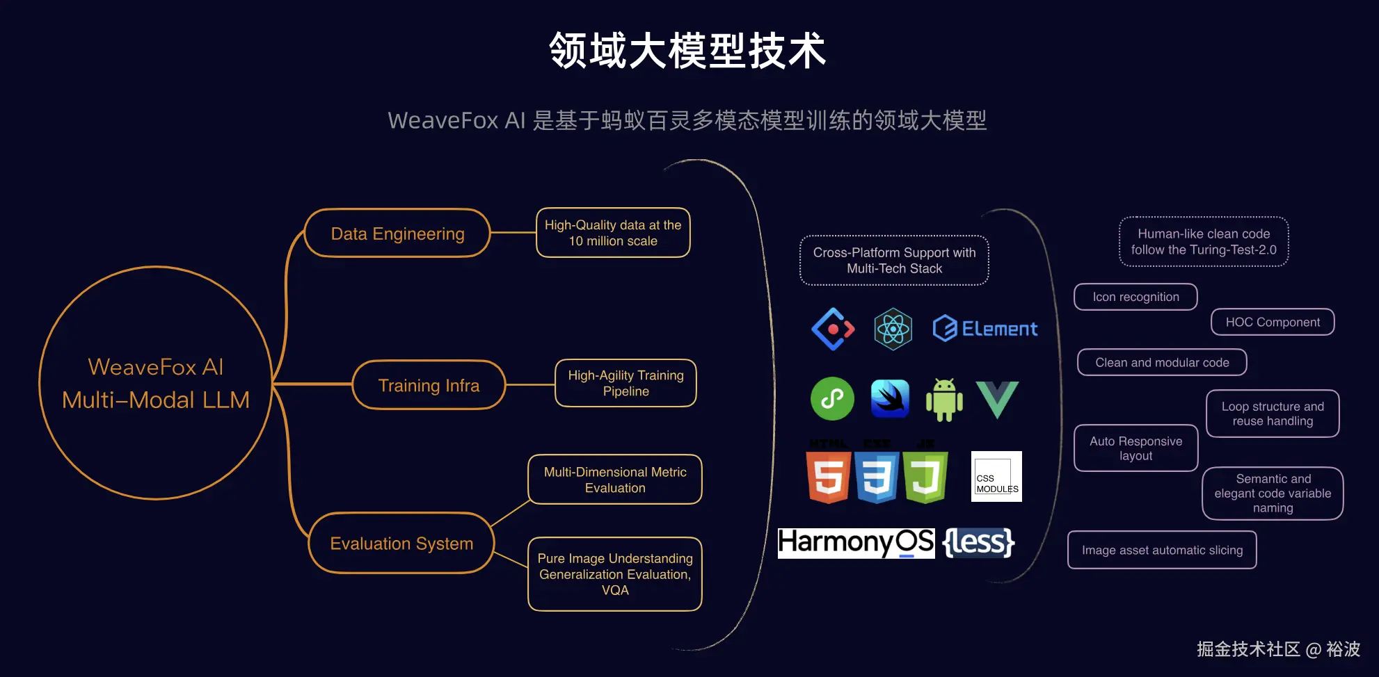 WeaveFox 基于蚂蚁自研的百灵多模态模型构建,是具备细粒度 UI 理解能力的前端领域大模型,为前端开发提供了更精准的代码生成和优化能力。