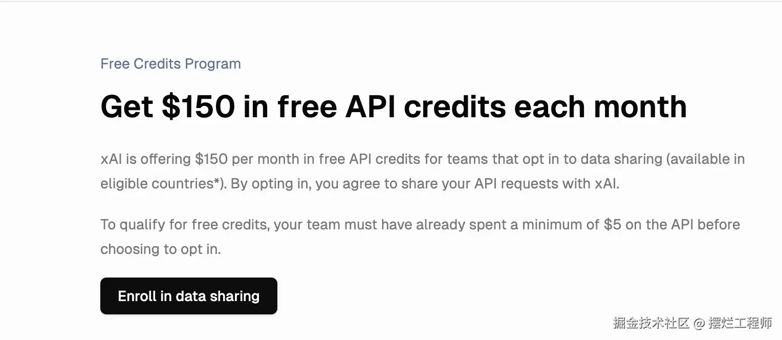 如果,你充值了 5 美元之后,还没有到账 150 美元的话,可以来这里查 Free Credits via Data Sharing | xAI Docs,因为需要签署一个数据共享协议: