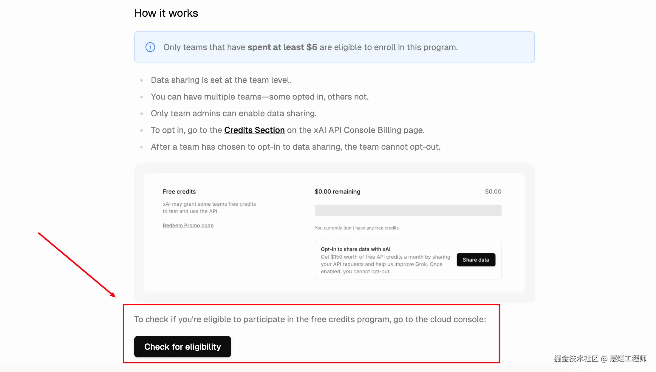 你充值5美元之后,在下方测试是否有资格的,可以点击 “check for eligibility“ 就行,之后再到 ”credit“ 里面选择共享数据就可以获得150美元的额度: