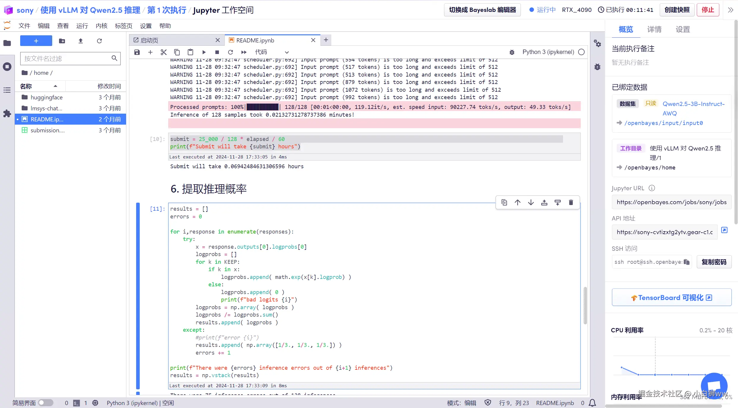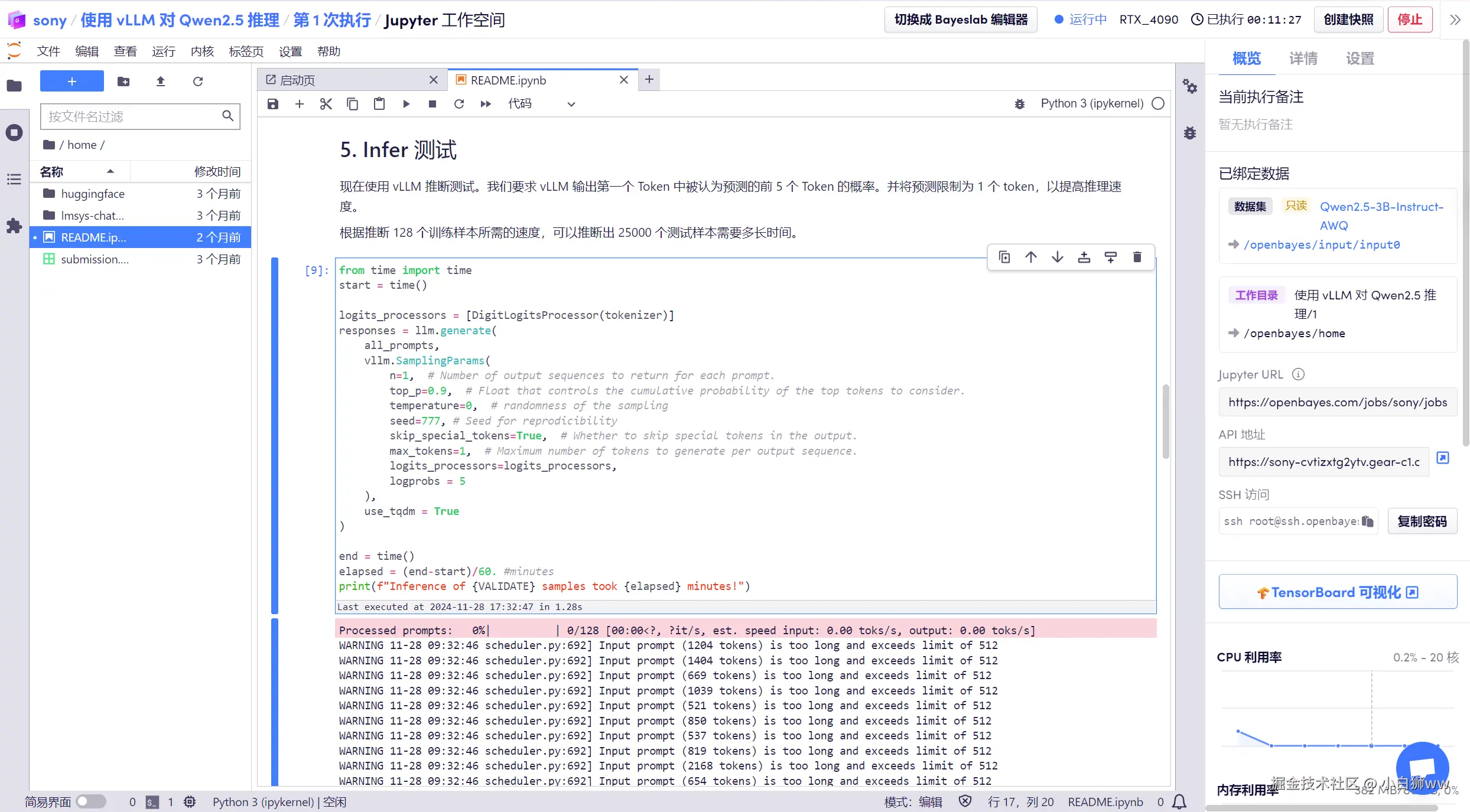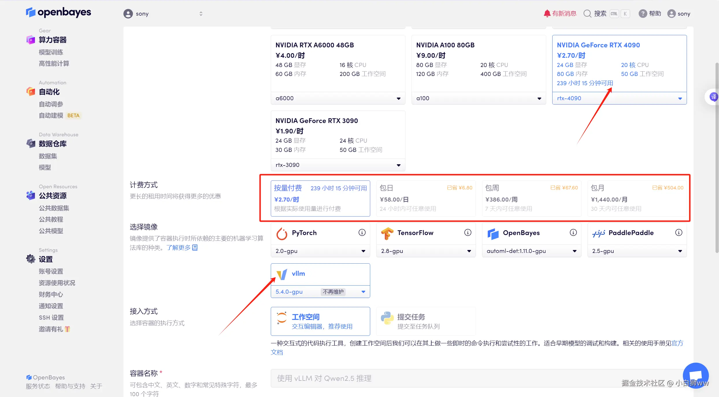 选择「NVIDIA GeForce RTX 4090」以及「vLLM」镜像,OpenBayes 平台上线了新的计费方式,大家可以按照需求选择「按量付费」或「包日/周/月」,点击「继续执行」。可以使用文章开头的邀请链接,获得 RTX 4090 使用时长!