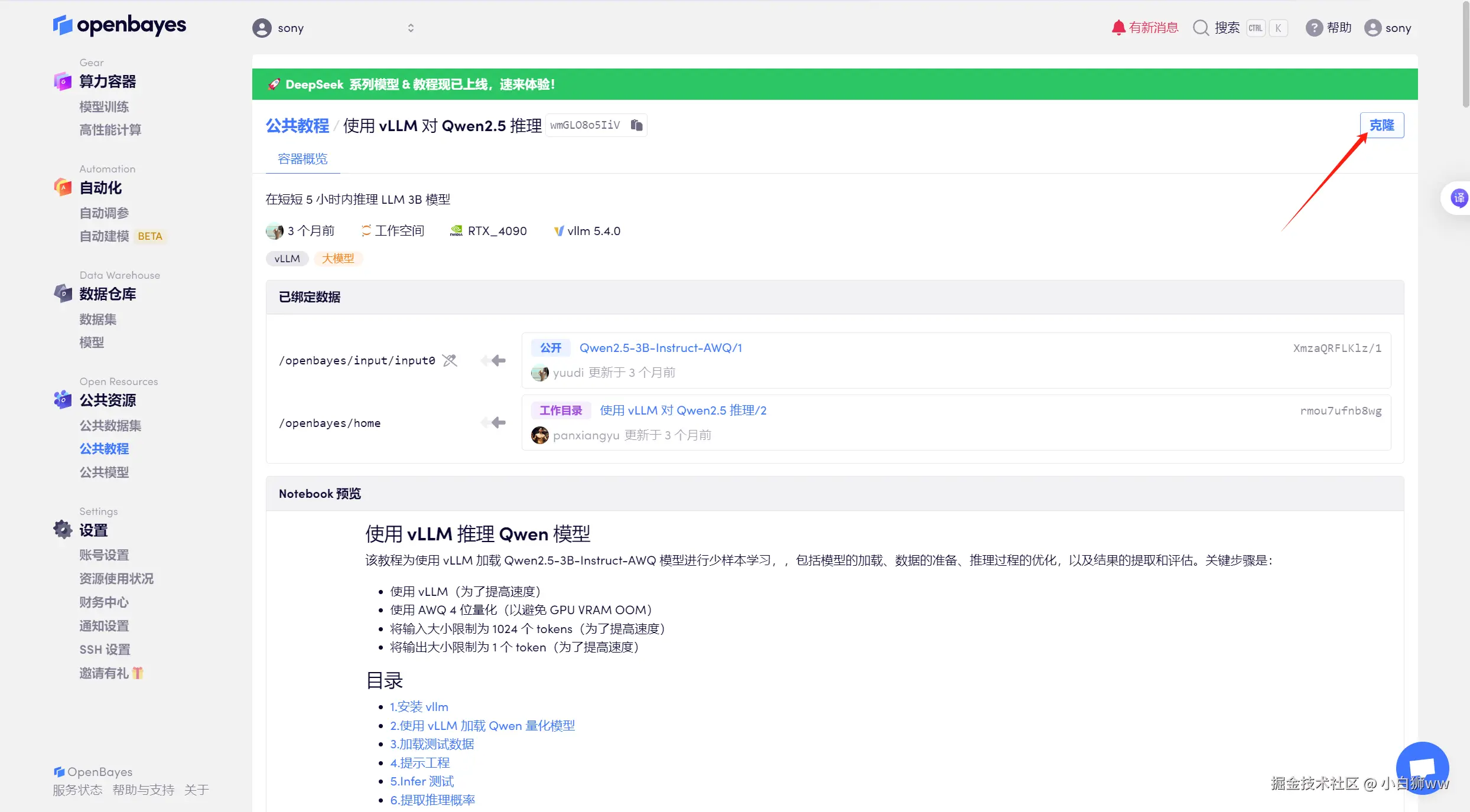 页面跳转后,点击右上角「克隆」,将该教程克隆至自己的容器中。