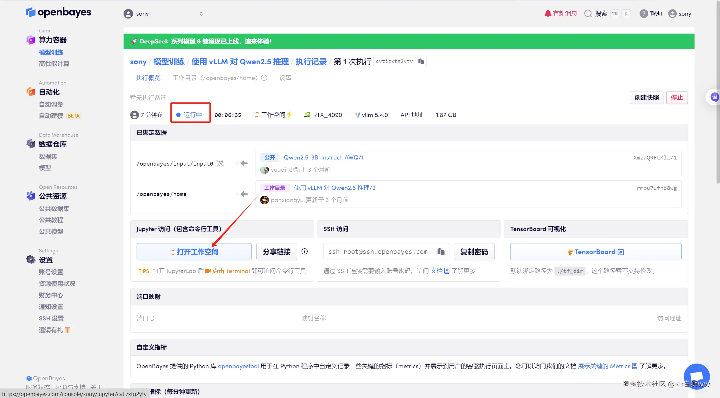 稍等片刻,待系统分配好资源,当状态变为「运行中」后,点击「打开工作空间」。
