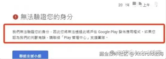 认证失败后,Google Play的首页顶部提示:无法验证您的身份。我们无法验证您的身份,因此您将无法通过此账户在Google Play发布应用,如果您认为我们的判断有误,请联系Play管理中心,支援团队。