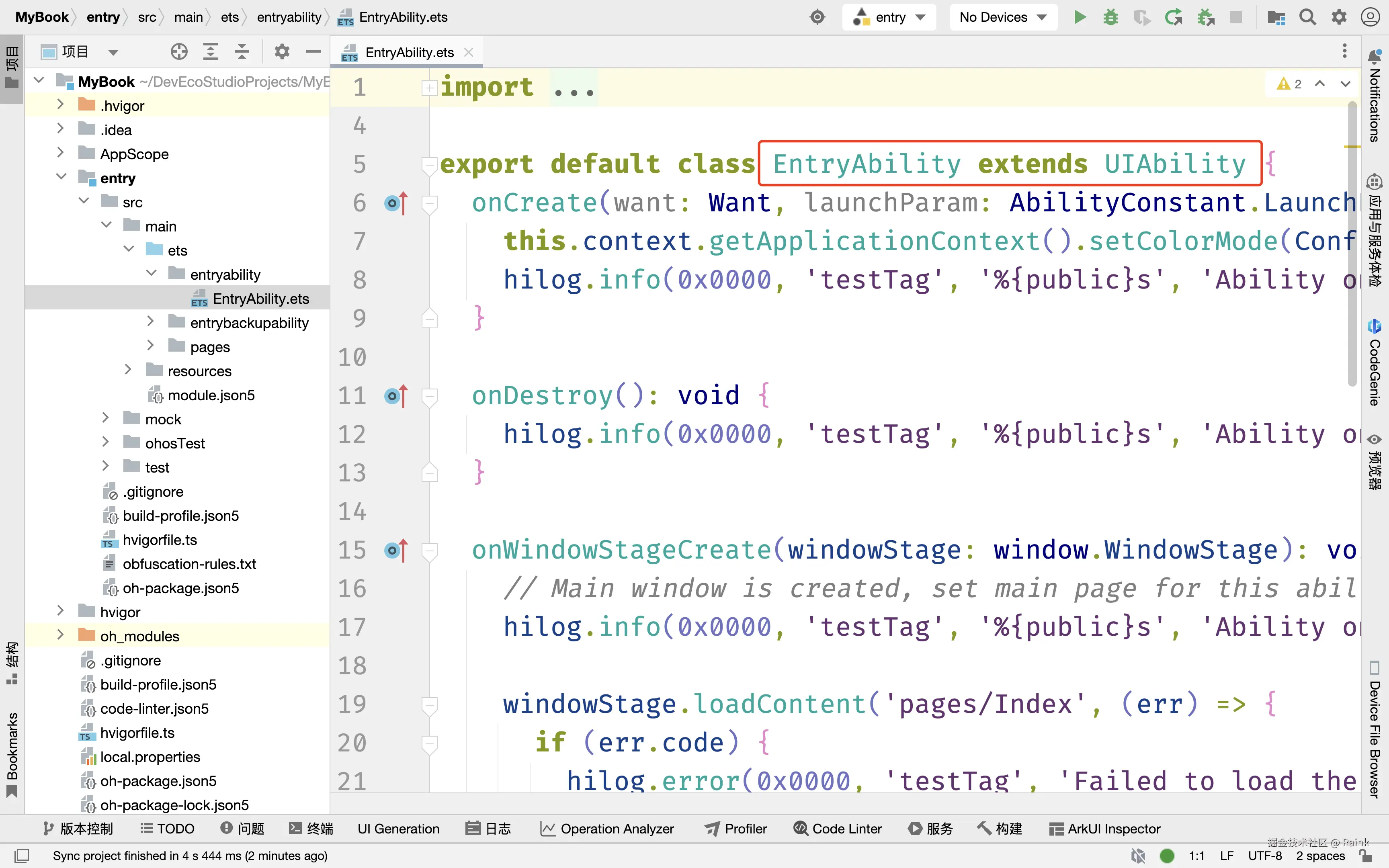 UIAblility组件是一种包含UI的应用组件,主要是用于和用户交互。在开发态新建一个项目时,IDE默认生成一个持有UlAbility组件的Model作为应用的主模块,该模块用于实现应用的入口界面和主特性功能。对于UIAblility组件,系统提供了具体的UlAbility类承载,支持面向对象的开发方式,如图7-1所示,系统默认生成的EntryAbility类继承了UlAbility类。