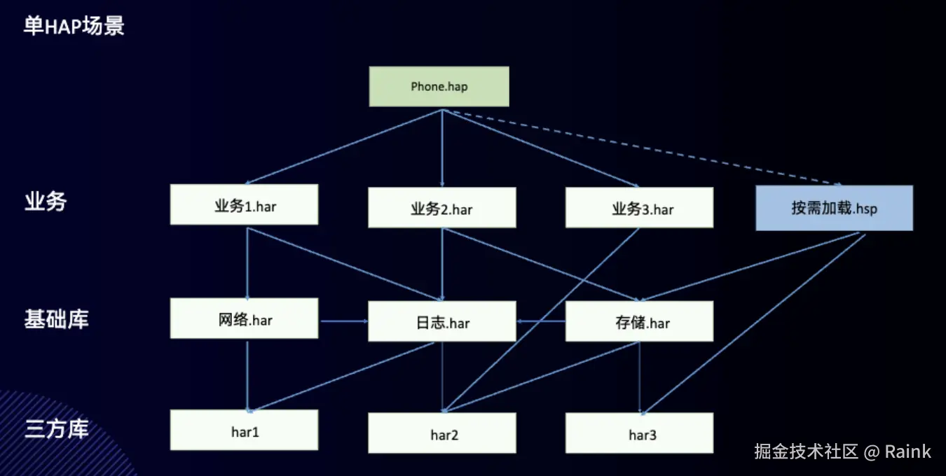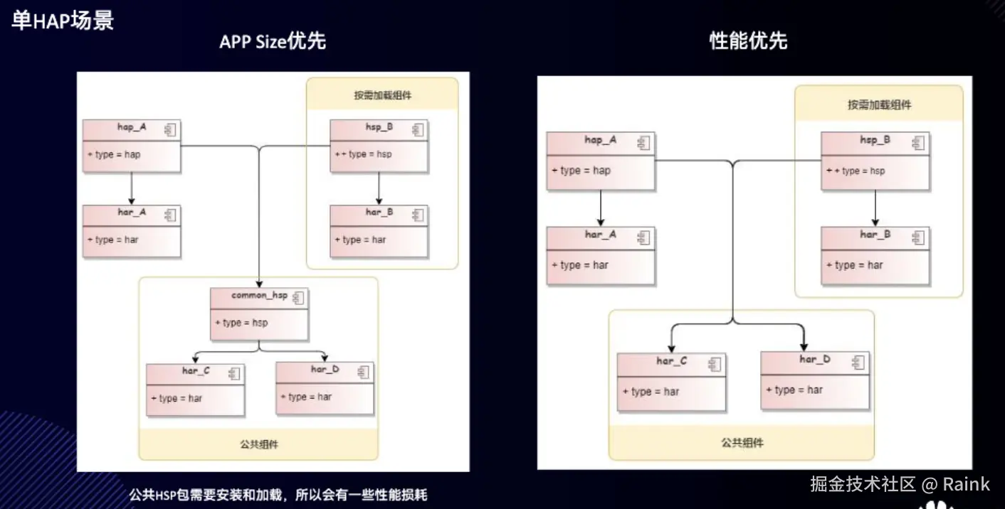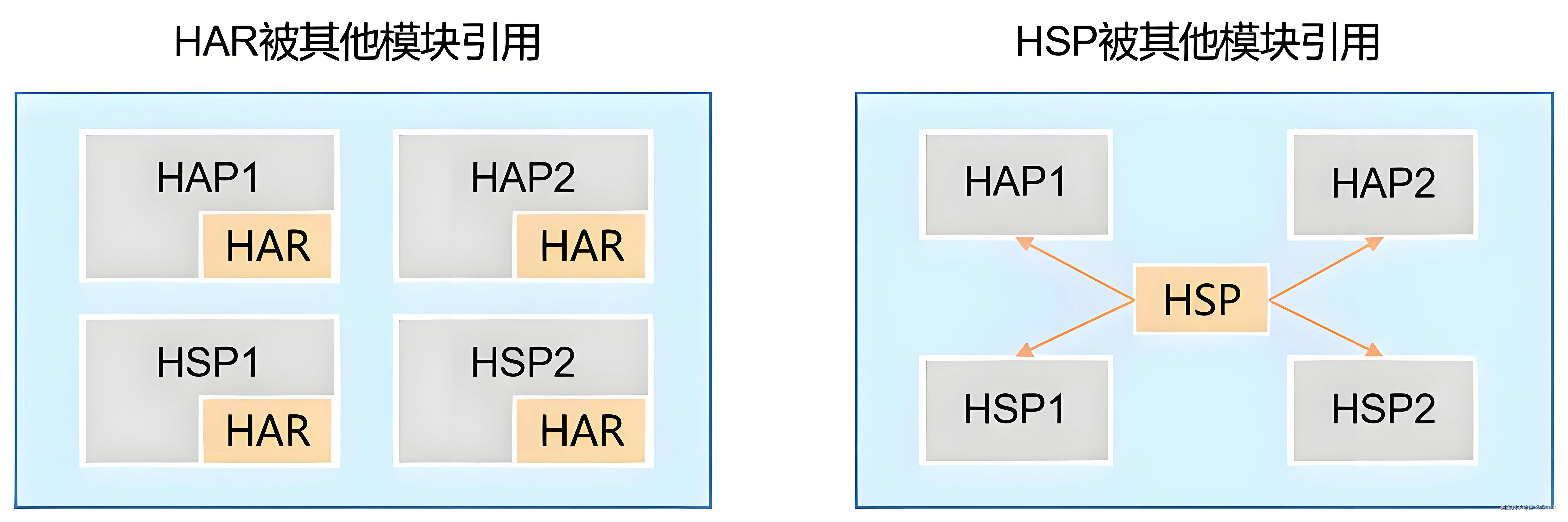 | HSP | HSP中的代码和资源可以独立编译,运行时在一个进程中代码也只会存在一份。 | HSP一般随应用进行打包,当前支持应用内和集成态HSP。应用内HSP只支持应用内引用,集成态HSP支持发布到ohpm私仓和跨应用引用。 |
