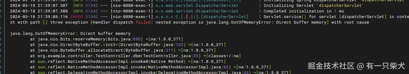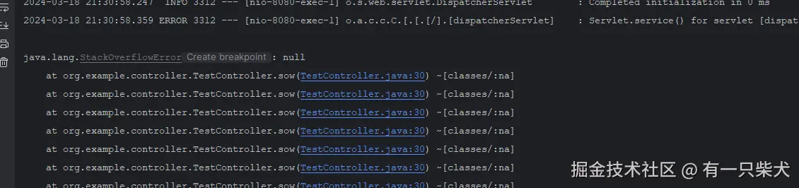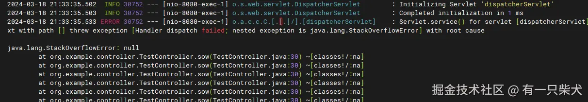 跟上面一样,windows启动访问http://localhost:8080/test/sow,出现栈溢出后,再次访问http://localhost:8080/test/say。