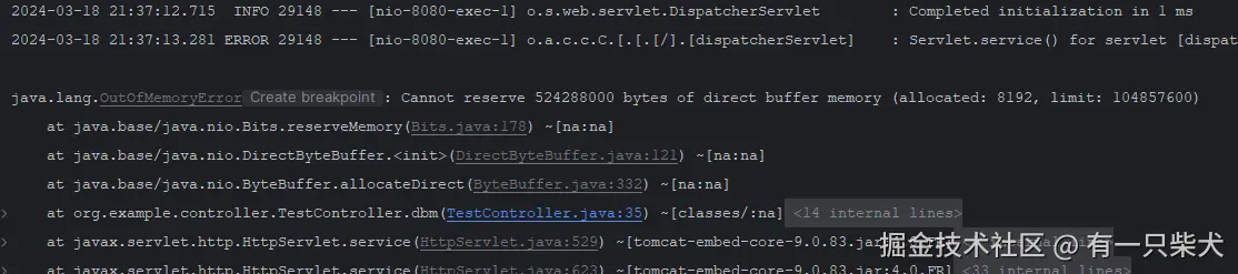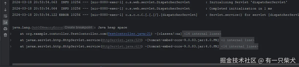 请求http://localhost:8080/test/oom,控制台提示了Java heap space。