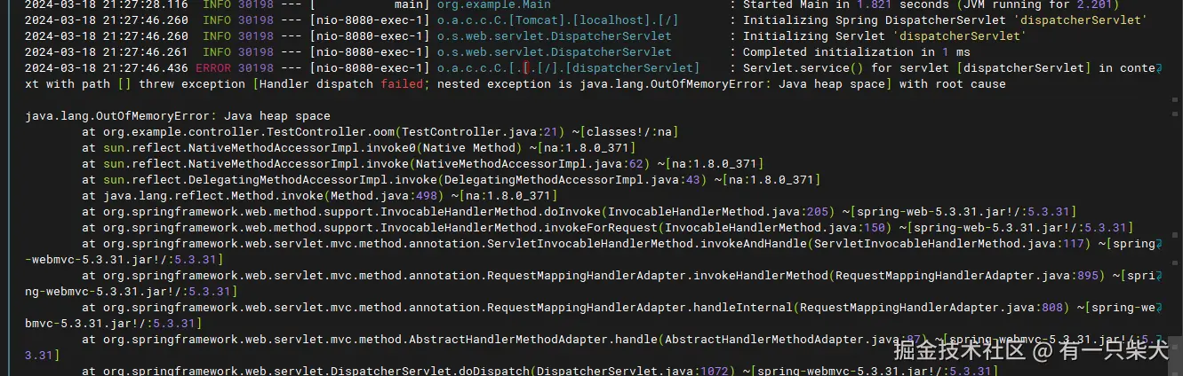启动后访问http://localhost:8080/test/oom,控制台输出Java heap Space错误。