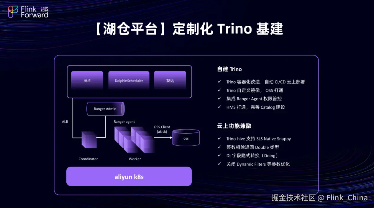 在定制化 Trino 基础设施的初期阶段,面临的是从 0 到 1 的建设挑战,这涵盖了容器化改造、 CI/CD 流程以及云上部署等多个方面。基于阿里云 Severless k8s 集群进行部署 Trino 自定义镜像。通过 AK、SK(访问密钥)链接 OSS 的方式,即 OSS Client,实现了与云上 OSS 存储的对接。此外,还增强了 Ranger Agent 的权限管控能力。第四点,我们接入内部 HMS(Hive Metastore),完善了整体 Catalog 的建设。
