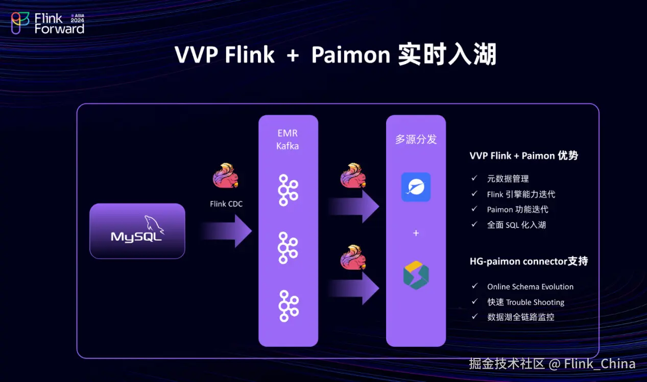 那么最终选择以 Paimon Flink 作为数据湖的入湖存储引擎,是基于 VVP Flink + Paimon 实时入湖的整体链路,这也是一个经典的架构。其流程是通过 MySQL 和 Flink CDC 写入 EMR Kafka,再通过 Flink 多源分发到 Paimon 以及 Connector。这一架构具有多个优势,尤其是在云端功能的增强方面,例如元数据管理、 Flink 引擎能力的迭代以及 Paimon 的功能迭代。
