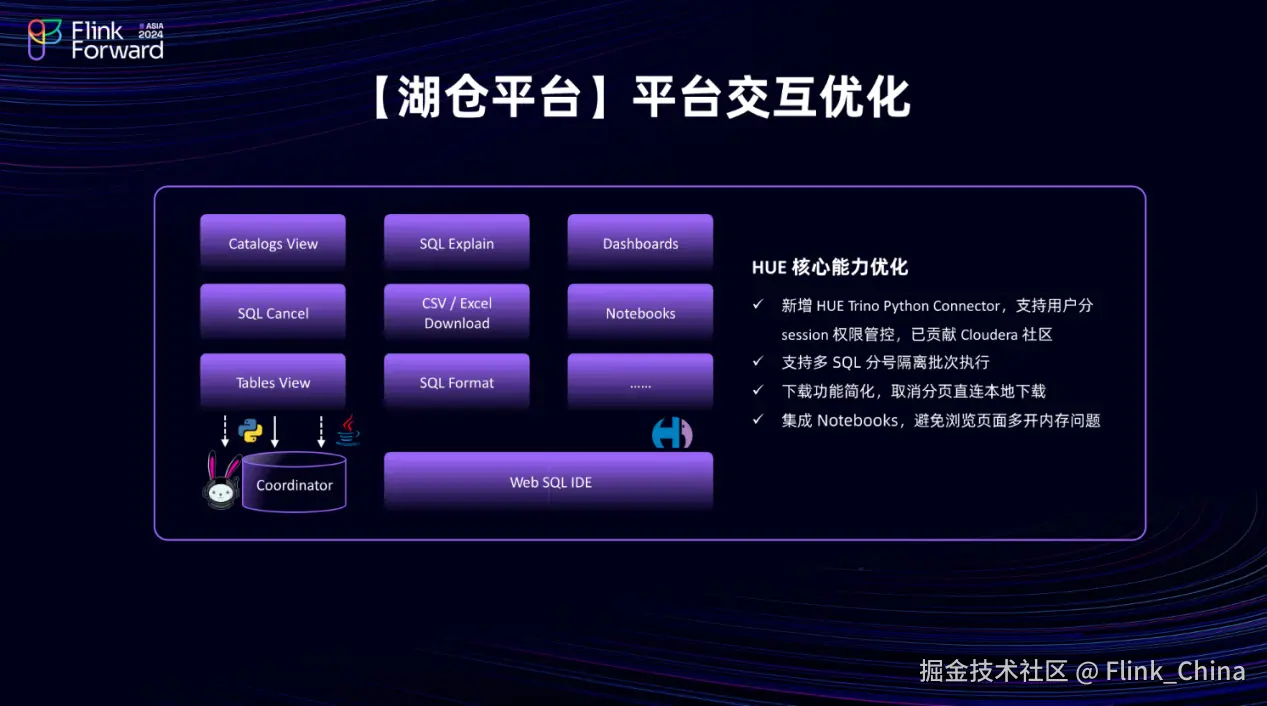 此外,还优化了一些用户常用的功能。例如,支持用户按照分号批量执行 SQL 语句。有些用户需要创建脚本、建表、修改分区等,这些操作可能涉及批量执行 SQL 语句,而在原生基础上并不支持这一功能。另外简化了下载功能,集成了 Notebooks,并修复了原生开源的一些问题。通过这些新的 Feature,完成了平台交互的优化。