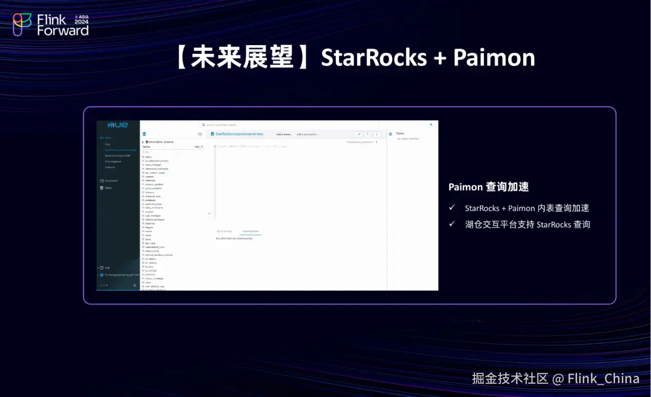 第二点,关于 StarRocks 与 Paimon 的结合,过去一年中,见证了 StarRocks 社区的迅猛发展。在面对性能要求较高的场景,如实时归因分析时,用户更倾向于在 StarRocks 上获得支持。因此,尝试通过构建 StarRocks 内表与 Paimon 相结合的方式,来实现查询加速。目前,已在内部测试了 EMR StarRocks 在 HUE 上的支持,这意味着用户可以通过 HUE 界面访问 EMR StarRocks,从而进行实时场景的数据开发与测试。
