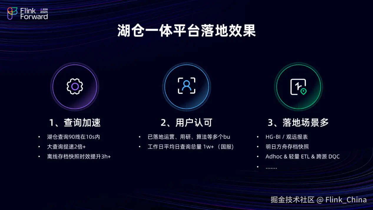 第三,离线存档快照的时效也得到了大幅提升。从之前的凌晨 4 点才能完成整点快照同步,到现在在 Paimon 基础上凌晨 1 点即可实现 0 点精确切分,这一改进得到了用户的广泛认可。