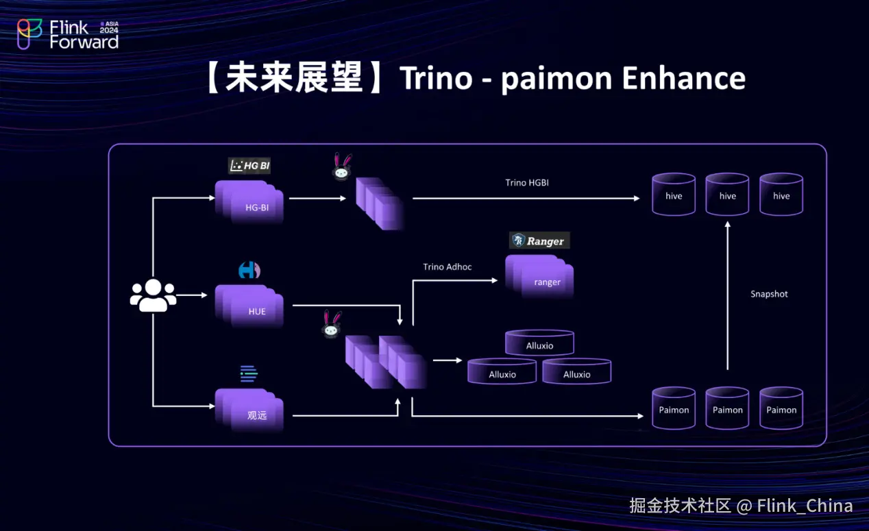 第一点,对 Trino 与 Paimon 的集成进行了加强,这主要面向当前体系中的用户。用户可以通过 HG-BI 或 OSS 看板功能来访问数据。对于 Hive 的存量数据,数据开发人员通常通过 HUE 的方式接入,而观远报表则通过报表查询的方式来访问 Paimon 或 Hive 数据。此外, HG-BI 可能还单独搭建了一套与自身相关的 Trino 集群,用于读取历史 Hive 数据。