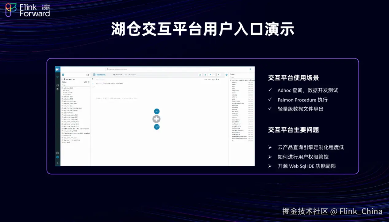 当用户使用湖仓管理平台时,这个用户入口交互平台主要有以下几个应用场景:首先是 Adhoc 查询,以及平台内部大数据的数据开发测试。此外,对于 Paimon 表,还包括数据修正的流程,因此需要对 Paimon 的 Procedure 提供支持。另外还提供轻量级的数据文件导出功能。
