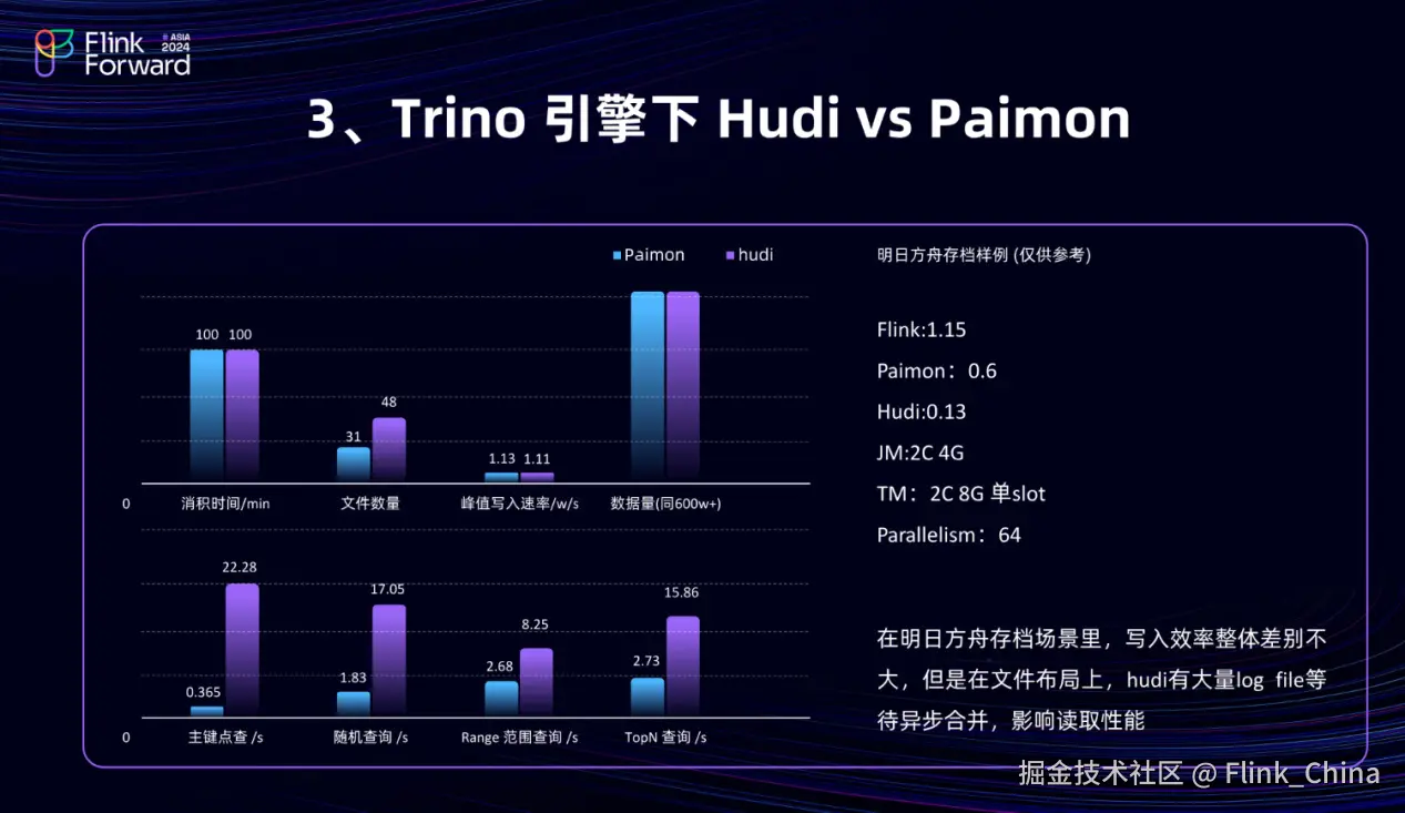 第 3 点是基于 Trino 引擎对 Hudi 和 Paimon 的入湖与读取性能进行对比。以明日方舟存档场景为例,该场景的测试数据量约为 600 万条。在数据消积时间上,可能需要大约 100 分钟。然而,在文件数量方面, Paimon 大约有 31 个数据文件,而 Hudi 则有 48 个,但 Hudi 在文件组织上仍然保留了 500 多个 Log Files。尽管在写入性能上,两者差距不大,但在读取性能,特别是主键点查方面,差异显著。