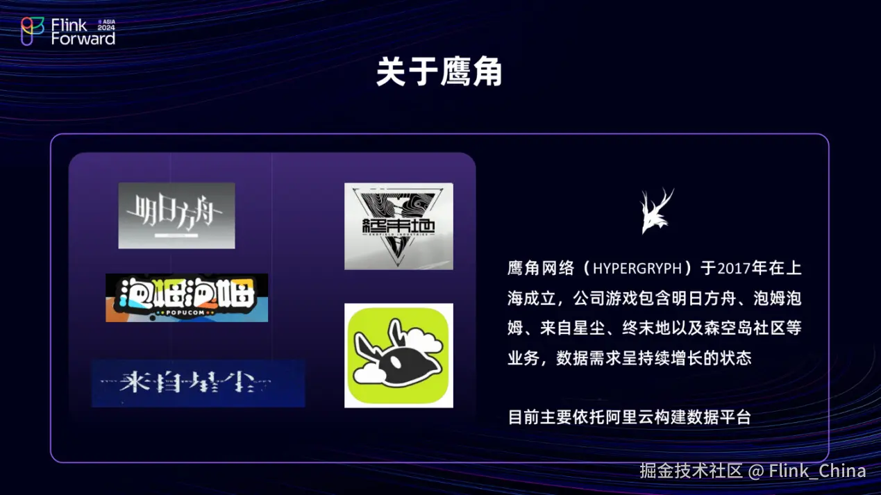首先给大家介绍一下鹰角目前的数据平台架构。在介绍之前,关于鹰角我先给大家做简单的介绍。