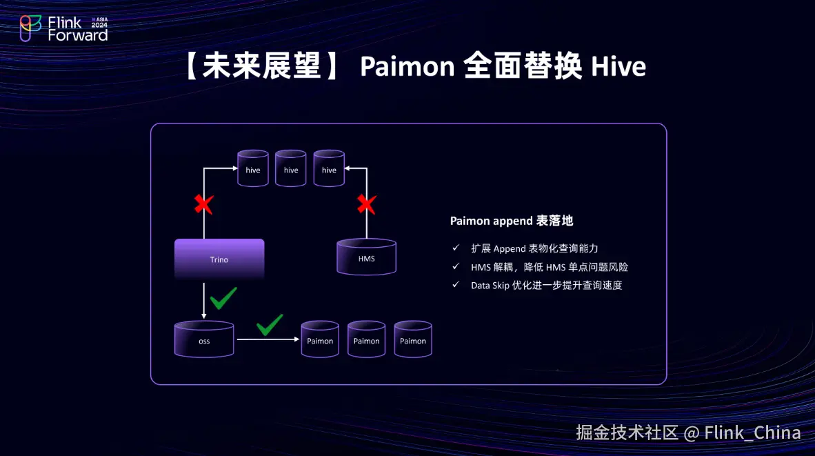 最后一点是关于 Paimon 全面替换 Hive 的议题,这确实是一个相对激进的做法。从 Trino 社区负责人的观点来看,他们更倾向于采用新的数据湖 format (Iceberg)来替代传统的 Hive 引擎。而在国内生态中, Paimon 也在进一步发展,得益于 Paimon 在解决 Upsert 入湖问题以及支持主键表和 Append 表场景方面的能力,特别是其聚焦于物化查询的能力,能够显著提升查询效率。