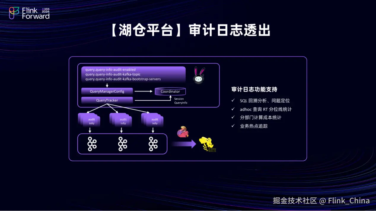 对于审计日志的原生不支持问题,进行了相应的扩展,即在 Trino 的 QueryManagerConfig 中新增了配置选项,包括 Kafka 的配置以及是否开启审计日志透出的管理。在 Coordinator 中,能够获取用户的 Session 信息和 QueryInfo(即 SQL 语句)。随后,在 Flink 中,将这些审计日志发送到 EMR Kafka 中,并进一步通过 Flink 写入到 Hive 表中。这样,实现了审计功能的支持,包括 SQL 回溯、问题定位以及性能诊断等相关功能。此外,还可以进行 Adhoc 查询的 RT 分位线统计。