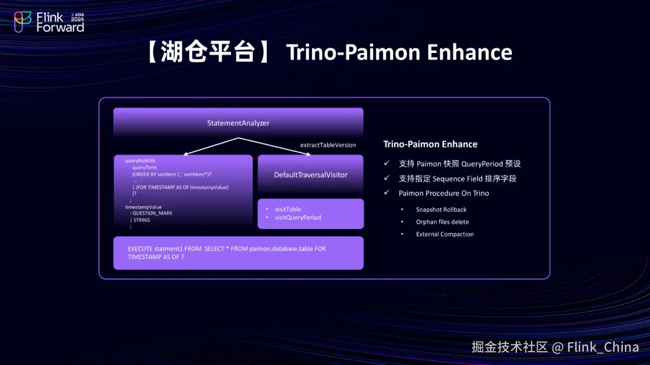 综上所述,通过扩展 Trino 语法、进行二次开发以及引入 Procedure 等方式,增强了 Trino 与 Paimon 的集成能力,并为用户提供了更加灵活和高效的操作方式。