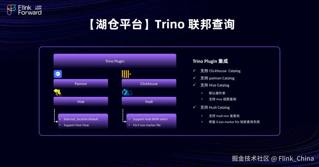 在支持 Hudi Catalog 上增加了 Hudi MOR 表的查询。由于历史原因,部分 Hudi 表尚未迁移到 Paimon 上,但在实时场景下,这些表仍需被读取以处理日志文件。因此,支持了对 Hudi MOR 表的近实时查询,并修复了相关问题。例如,在 Hudi 的某些场景中,可能会出现大小为 0 的 Marker File,这可能导致 Trino 在扫描时将这些无效文件纳入查询范围,从而造成查询卡顿,在内部镜像中对类似的问题进行了修复。