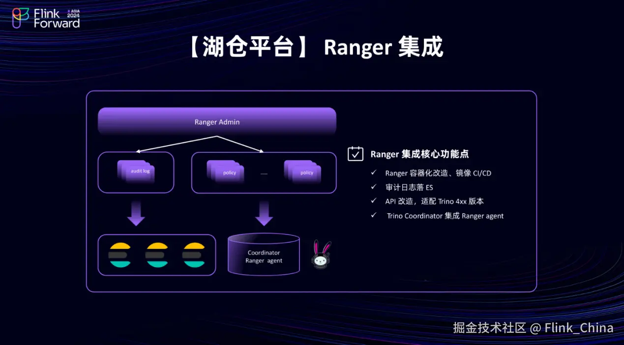 实际上,通过底层自建的 Ranger 集成来实现这一目标。这个集成主要涉及到 Ranger 的容器化改造,包括镜像的 CI/CD 流程、审计日志落地到 Elasticsearch(ES),以及对 API 的改造,以适配 Trino 4xx 版本。需要特别注意的是, Ranger 对于 Trino 400 以上的新版本支持并不完善。因此,还需要对 API 以及 Trino Coordinator 与 Ranger Agent 的兼容性进行适配。