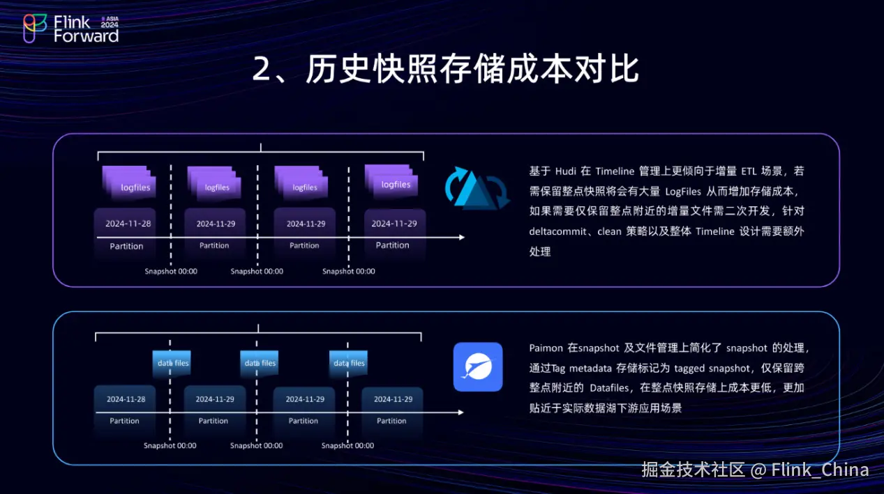 第 2 点是关于历史快照存储成本的对比。假设每天需要在零点整点时刻存储快照,在 Hudi 的场景中,它更倾向于处理增量数据的场景。如果保留整点快照,将会有大量的 Log Files 存储在 OSS 中。如果仅需要保留整点附近的 Log Files,则需要对 Hudi 进行二次开发。首先,要调整其 Delta Commit 和 Clean 策略;其次,要对整个 Timeline 体系进行额外处理。这种做法实际上开发以及运维成本会比较高。