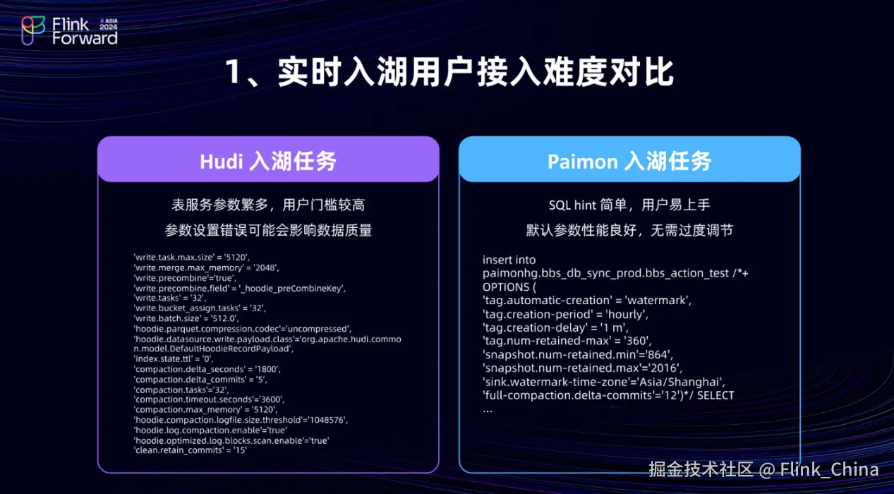 首先介绍实时数据入湖与用户接入难度的对比。从左侧的这两个示例中,可以看到在相同存档场景下, Hudi 入湖表服务的配置参数。在配置过程中, Hudi 需要进行多项设置,例如 Write 相关算子的并发度设置、索引压缩以及表服务参数配置,如 Clean 相关的表服务设置等。相比之下,在 Paimon 入湖传递中, Write 算子相关的设置可能主要集中在并发度上。至于 Compaction 的参数配置,可能仅需设置 Full-compaction 拍摄的 Delta-commits 数量,而其余部分则多与业务相关。例如,需要保留多久的 Tag,以及 Snapshot 的保留周期有多长等。对于初级数据开发人员来说,他们实际上可以轻松地完成这些简单且高效的入湖参数配置。