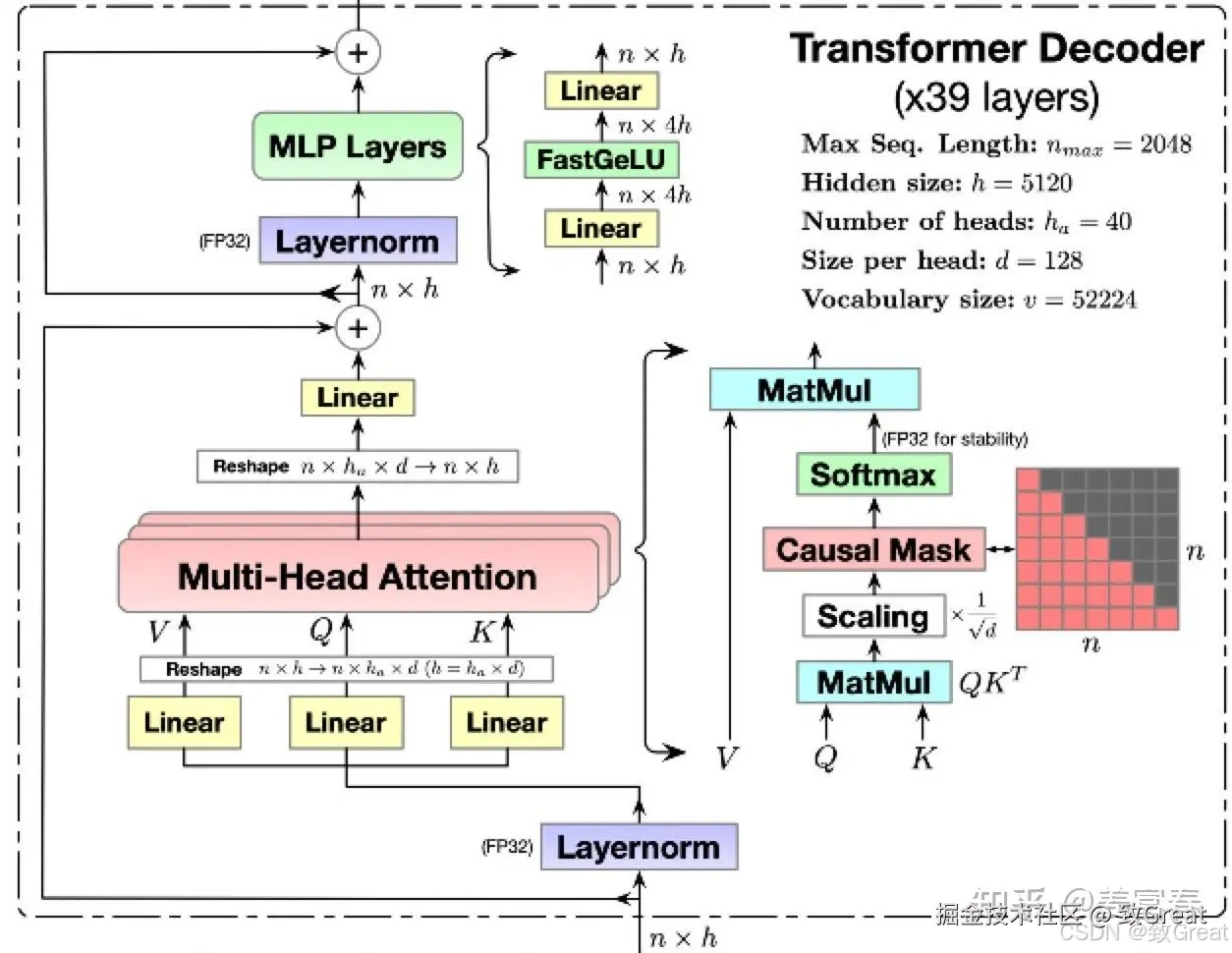 在LLM生成过程中,是一个基于前向序token列预测下一个token的过程,序列中的token(无论是prefill阶段,还是decode阶段)只与它前面的token交互来计算attention,我们也称这种Attention为Causal Attention。矩阵计算上通过一个下三角的Causal Attention Mask来实现token交互只感知前向序列。如图1所示,展现的Transformer内部的细节: