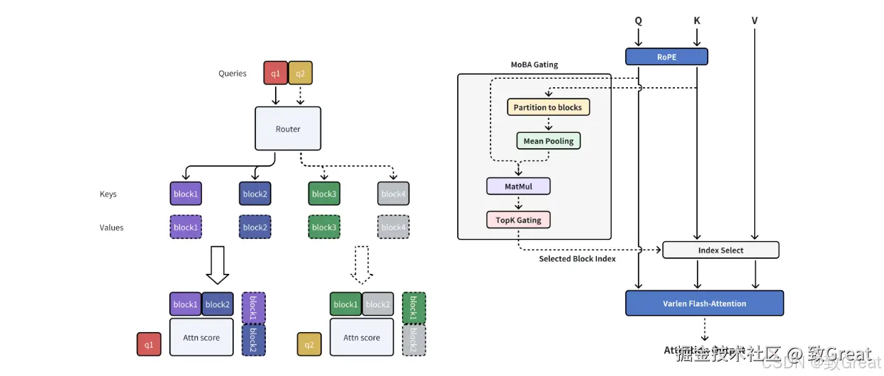 - 不关注未来块:MoBA确保查询令牌不会被路由到任何未来块,将注意力范围限制在当前和过去块,遵循语言建模的自回归性质。形式上,记为查询的位置索引,对于任何满足的块,设置,。