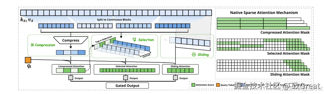 - 令牌选择(Token Selection):仅使用压缩键值对可能会丢失重要的细粒度信息,因此NSA设计了高效的令牌选择机制。