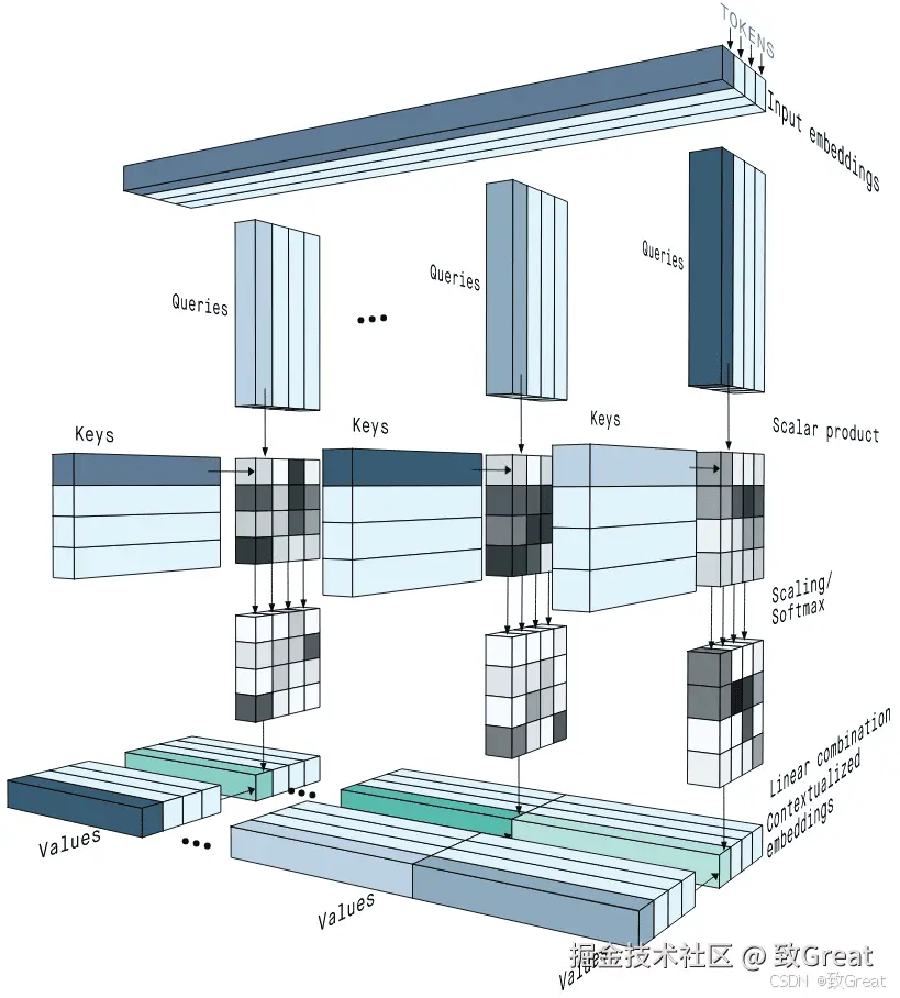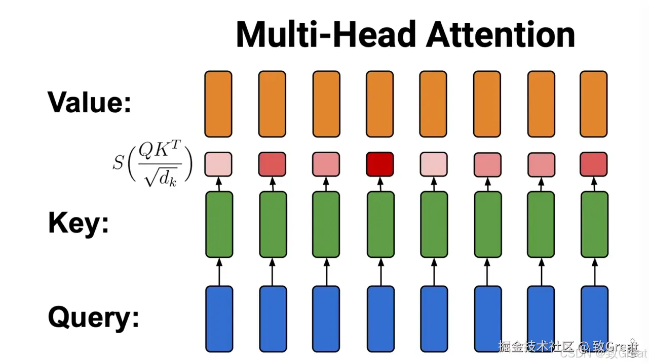 我们以一个序列的 位置的 token 为例,计算一层 Transformer 的 attention 过程,如列下公式所示: