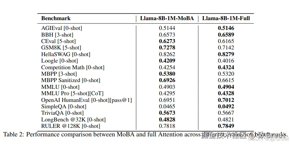 - Llama 3.1 8B基础模型:MoBA与全注意力在多个长上下文基准测试中表现相近,且MoBA在长上下文任务中有较好表现,尤其在RULER和Needle in a Haystack基准测试中,表现几乎相同。