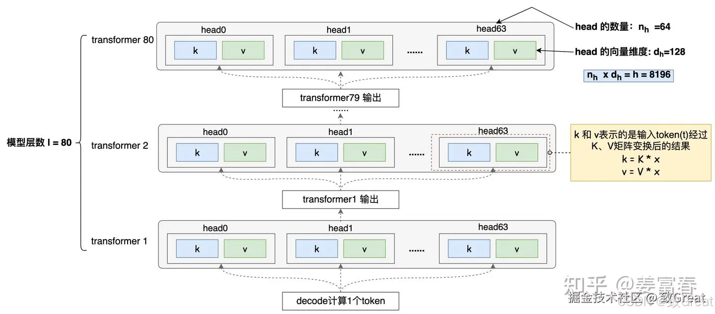 如下图所示,计算一个token,每个Transformer层的每个Head都需要存储一对, 。