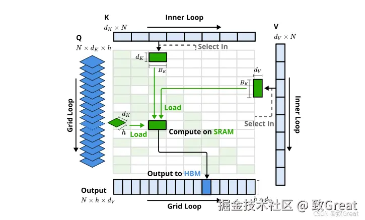 - 共享KV获取(Shared KV Fetching):在内循环中,按顺序将连续的键/值块加载到SRAM中,分别表示为,,以最小化内存加载,其中是满足的内核块大小。