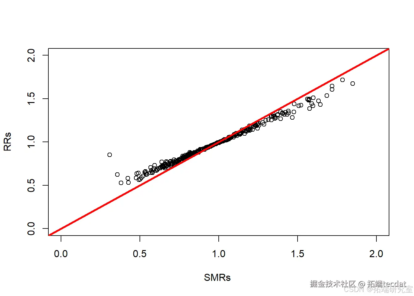 plot(RR_vals$SMR, RR_vals$RR, xlim = c(0, 2